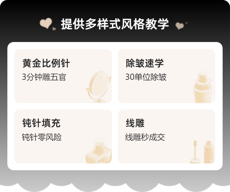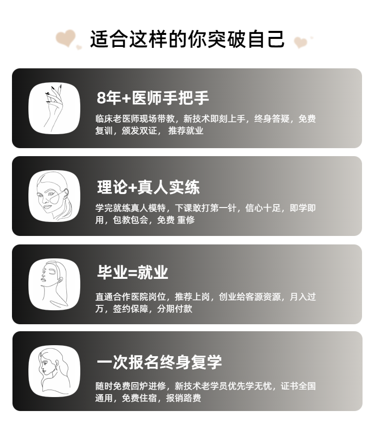 4:培训课程,内容不仅包括所有的注射美容,微整形项目,而且还重点传授美学,人体面部美容设计,微整形心理学,微整形市场营销等经营战略,战术的知识,针对每位学员的具体经营状况,做出实用有效的指导方案,确保每位学员能够将业务开展起来。